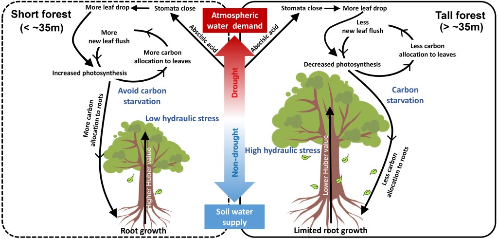 Taller tropical forests experienced greater relative canopy reductions during drought and larger non‐drought increases than shorter forests, but the net effect of drought was more negative in the taller forests. Meta‐analysis of in situ hydraulic traits supports the hypothesis that taller tropical forests are more vulnerable to drought stress due to smaller xylem‐transport safety margins. The hydraulic failure and carbon starvation hypotheses are two main non‐mutually exclusive theories to explain drought‐induced dynamics of tropical forests because of significant carbon–hydraulic interactions. …more