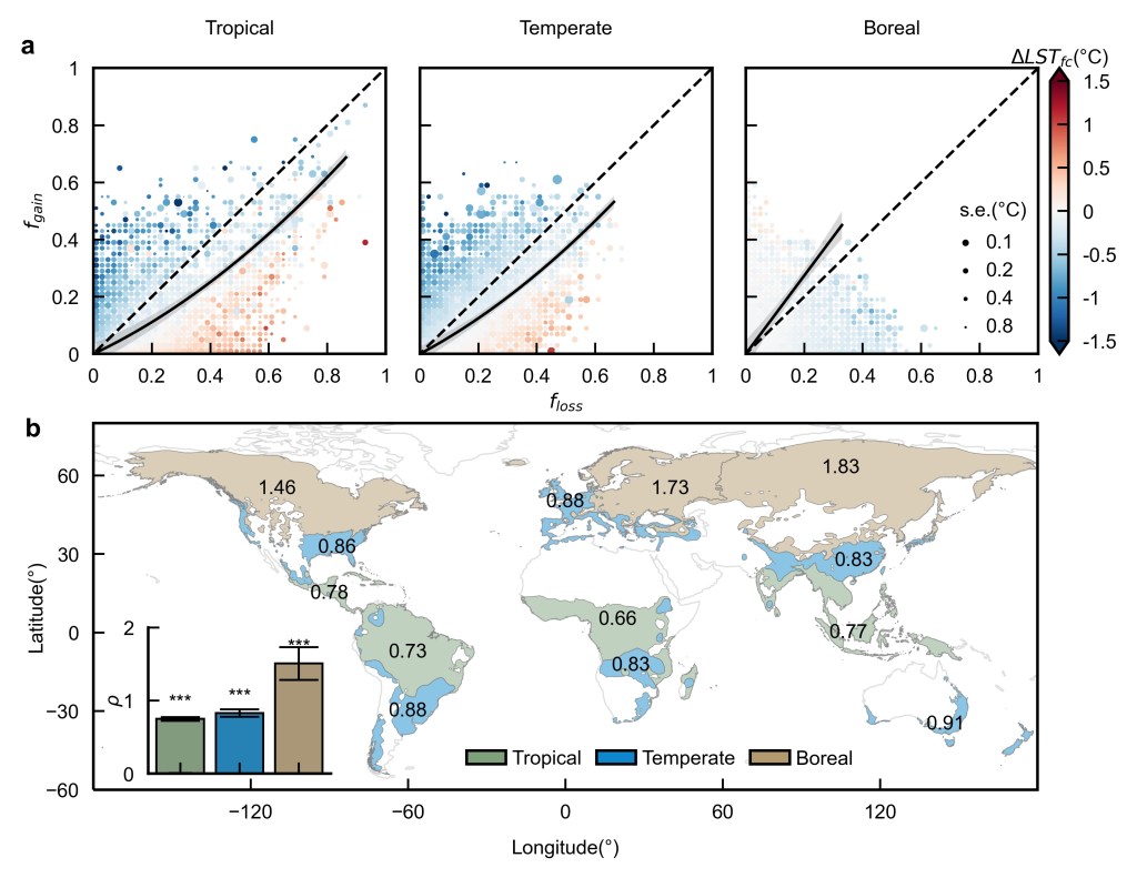 The direct biophysical effects of fine-scale tree cover changes on temperature are not well understood. Here, we show how land surface temperature responds to subgrid gross tree cover changes. We find that in many forests, the biophysical cooling induced by enhanced evapotranspiration due to tree cover gain is greater in magnitude than the warming from tree cover loss. Therefore, the goal of no biophysical warming effects from tree cover changes could be achieved by regaining a fraction of previously lost tree cover areas. This percentage differs between different forest biomes, ranging from 75% in tropical to 83% in temperate forests. Neglecting this asymmetric temperature effect of fine-scale tree cover change ignores the fact that biophysical feedbacks continue to cause surface temperature changes even under net-zero tree cover changes. Thus, it is necessary to account for gross, rather than net, tree cover changes when quantifying the biophysical effects of forests. …more